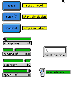 The main particle action is "particle.move." The first line of the procedure changes the particle heading according to its charge, size and the strength of the field. The command that is used: