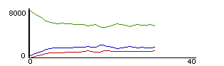 Visually, the oscillations were striking. Red objects (turtles) and green objects (food) were always intermixed, but the density of each continually changed. Initially, the screen was dominated by red turtles, with a sparse scattering of green food. As the density of red objects declined, the green objects proliferated, and the screen was soon overwhelmingly green. Then the process reversed: the density of red increased, with the density of green declined.
